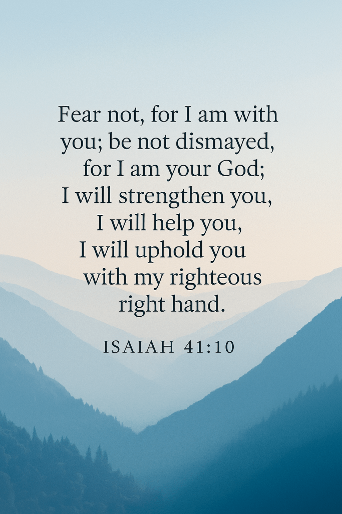 1. Isaiah 41:10 – Fear not, for I am with you; be not dismayed, for I am your God; I will strengthen you, I will help you, I will uphold you with my righteous right hand.