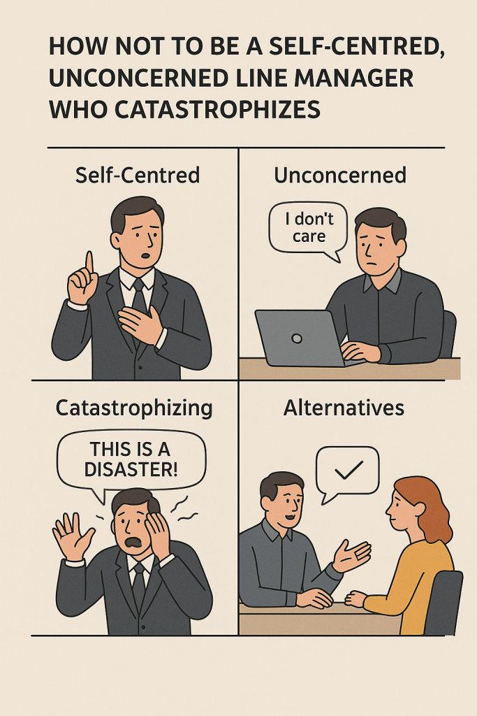 So, don’t be the self-centred, unconcerned manager who catastrophizes. Be the steady leader who listens, supports, and keeps perspective—even when the pressure’s on.