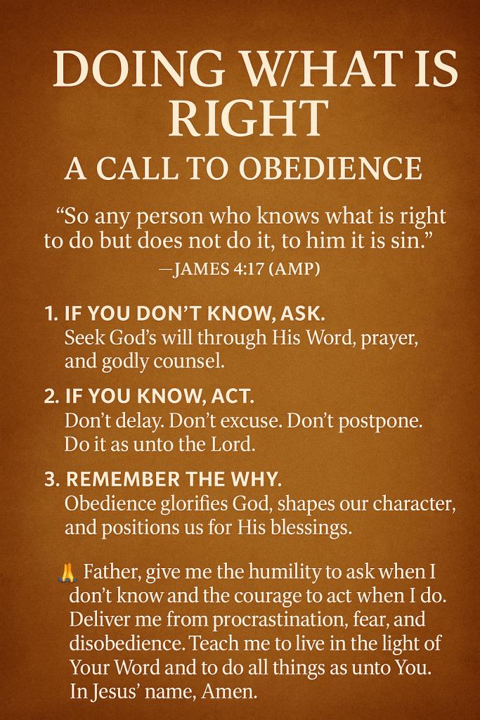 🙏 Father, give me the humility to ask when I don’t know and the courage to act when I do. Deliver me from procrastination, fear, and disobedience. Teach me to live in the light of Your Word and to do all things as unto You. In Jesus’ name, Amen.
