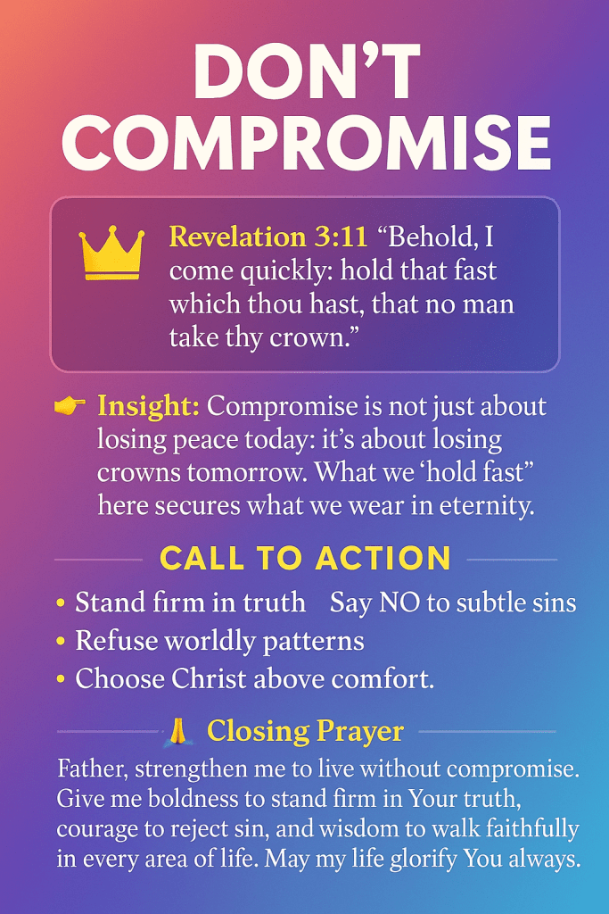 👉 Insight: Compromise is not just about losing peace today; it’s about losing crowns tomorrow. What we “hold fast” here secures what we wear in eternity.