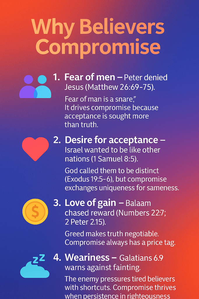 👉 Fear of man is a snare (Proverbs 29:25). It drives compromise because acceptance is sought more than truth.