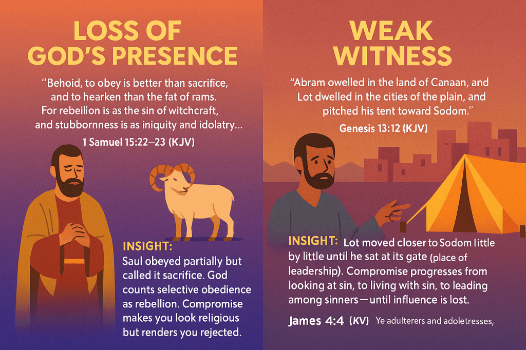 👉 Insight: Lot moved closer to Sodom little by little until he sat at its gate (place of leadership). Compromise progresses from looking at sin, to living with sin, to leading among sinners — until influence is lost.