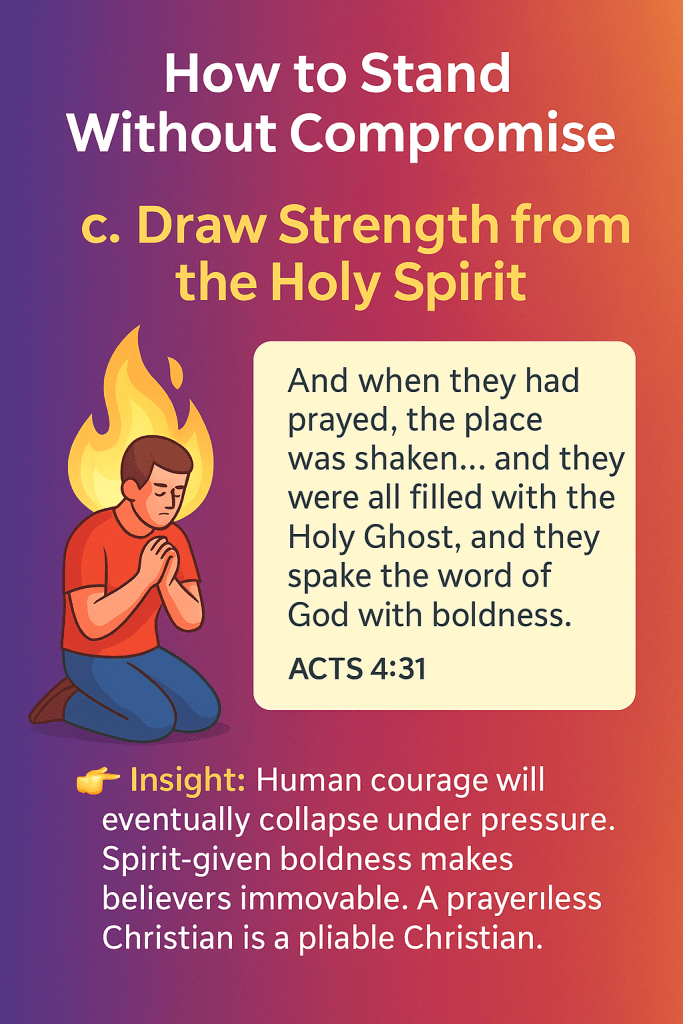 👉 Insight: Human courage will eventually collapse under pressure. Spirit-given boldness makes believers immovable. A prayerless Christian is a pliable Christian.